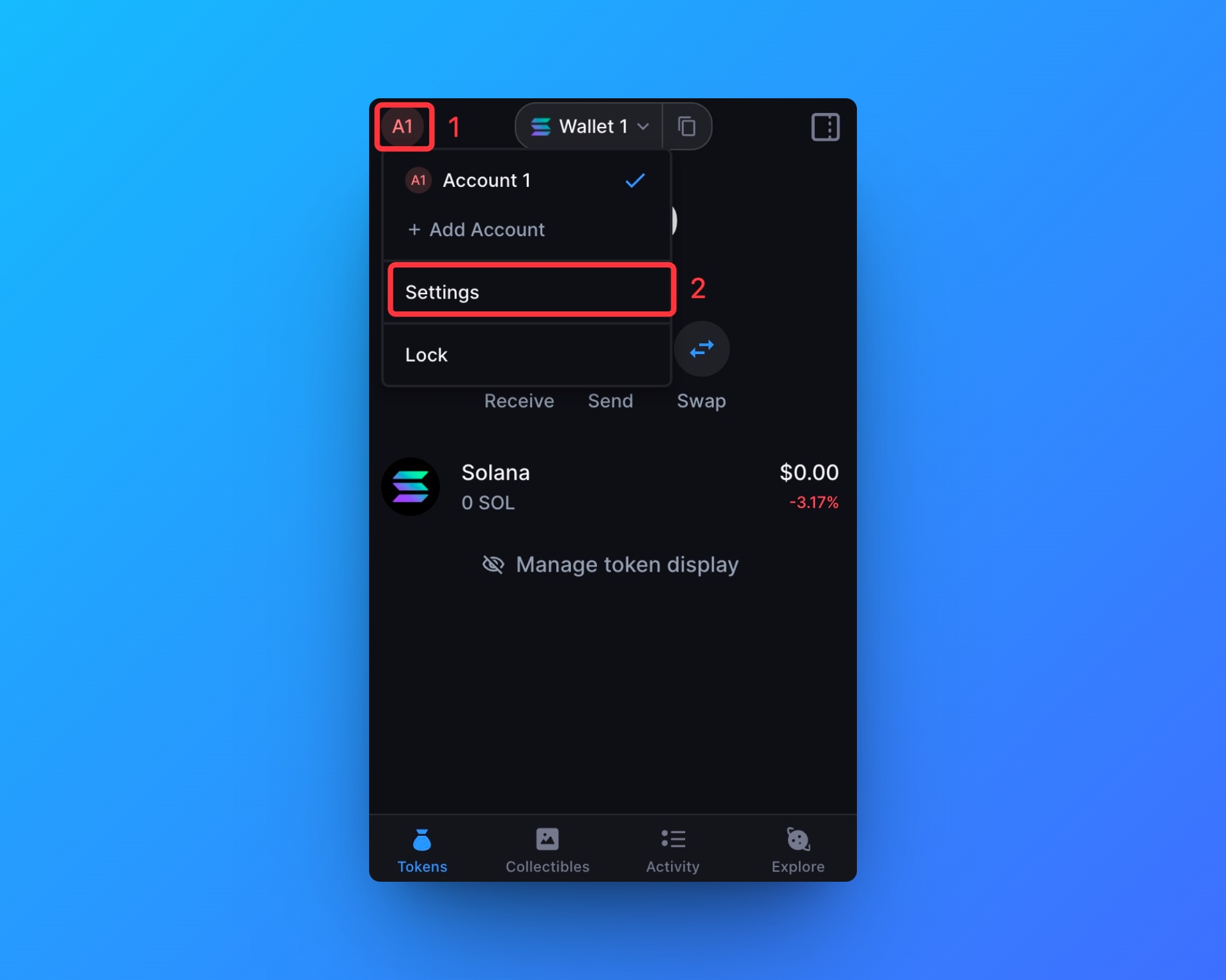 Step 1: Open your Backpack wallet, click on the account icon in the upper left corner, and then click on "Settings.”
